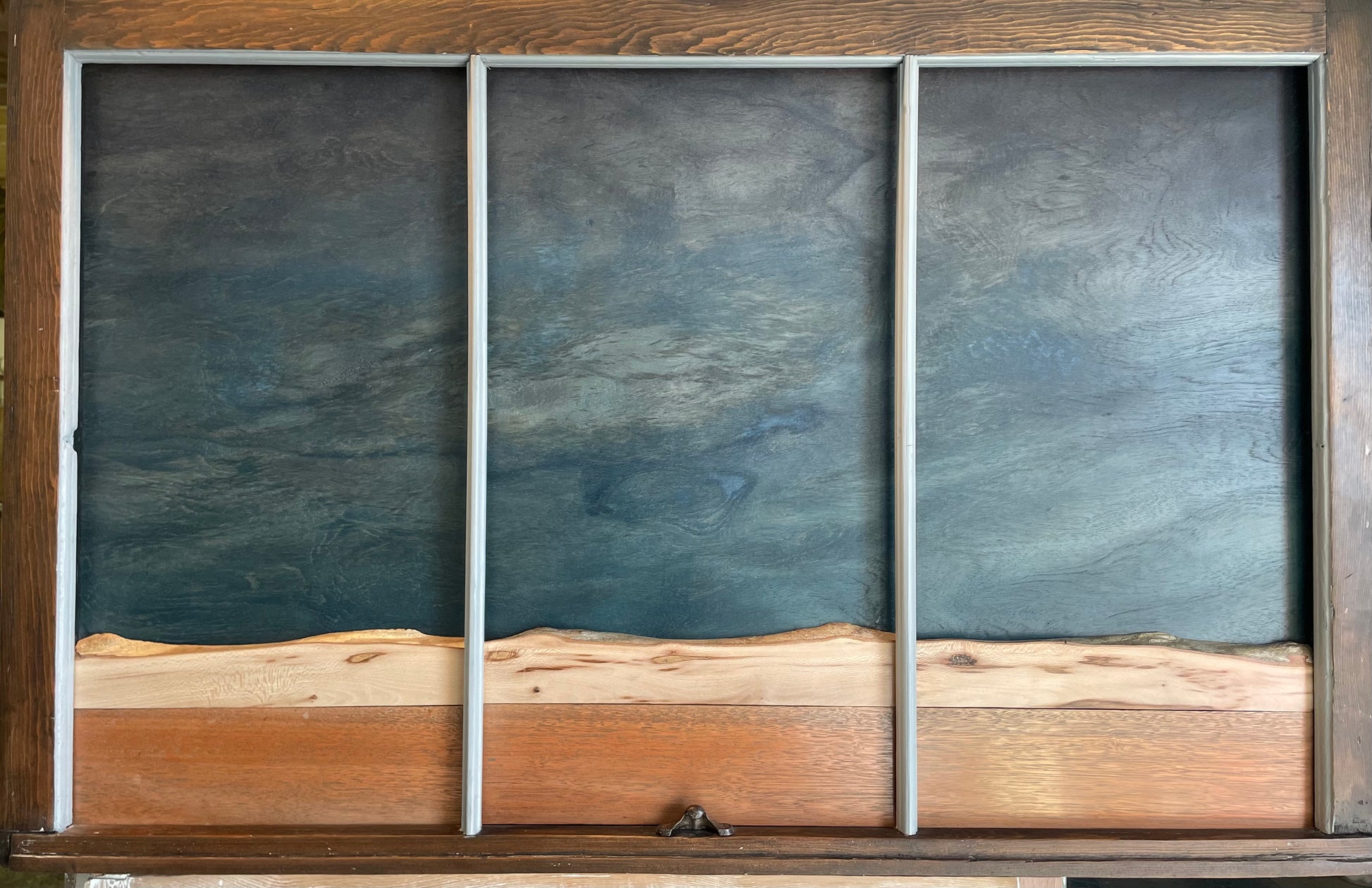 Dyed birch and local sycamore from Hurricane Milton and reclaimed cedar in a historic window frame.