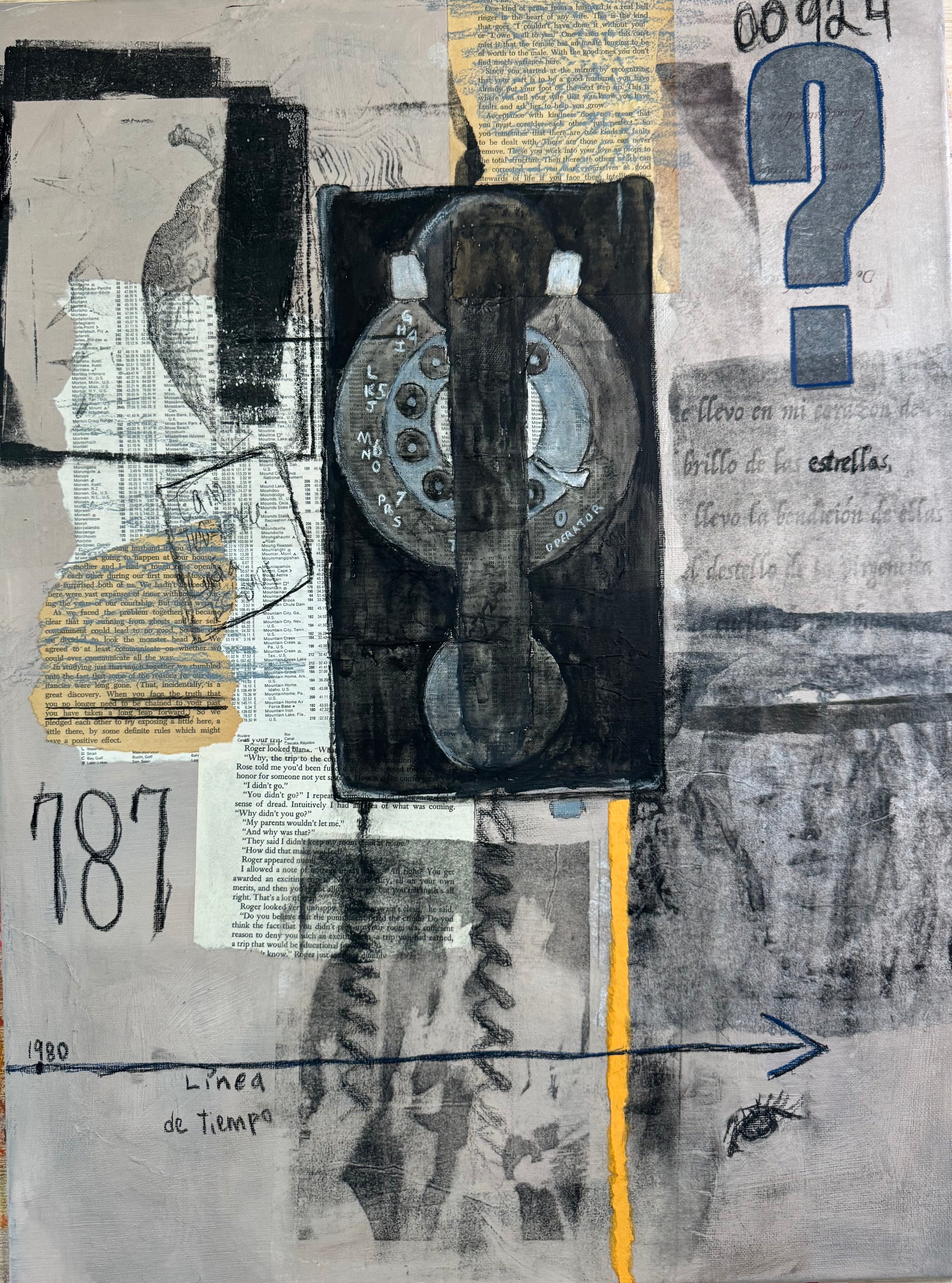 24" x 18", Acrylic, collage (paper, found objects), and pastel on canvas.
